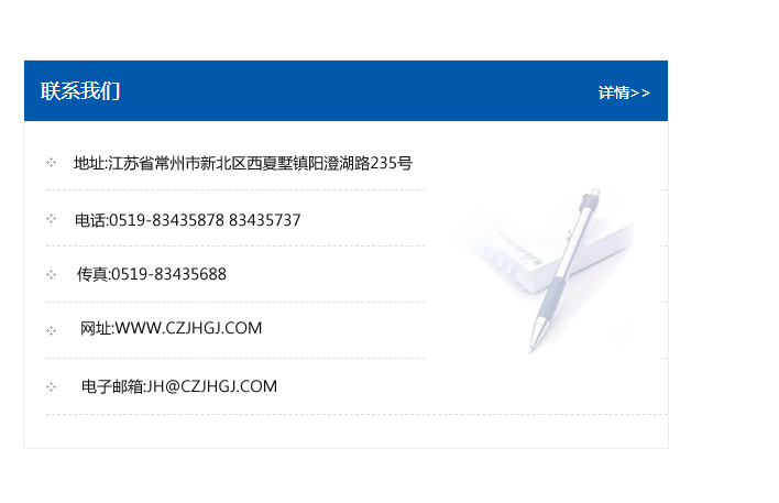 傳真:0519-83435688    郵編:213135    網址:WWW.czjhgj_com.dfrjh.com    電子郵箱:JH@czjhgj_com.dfrjh.com